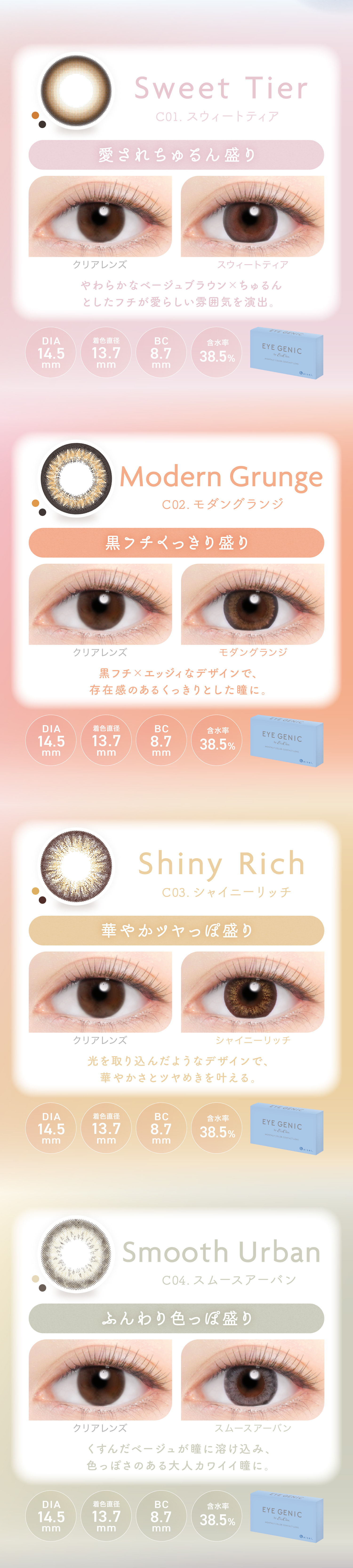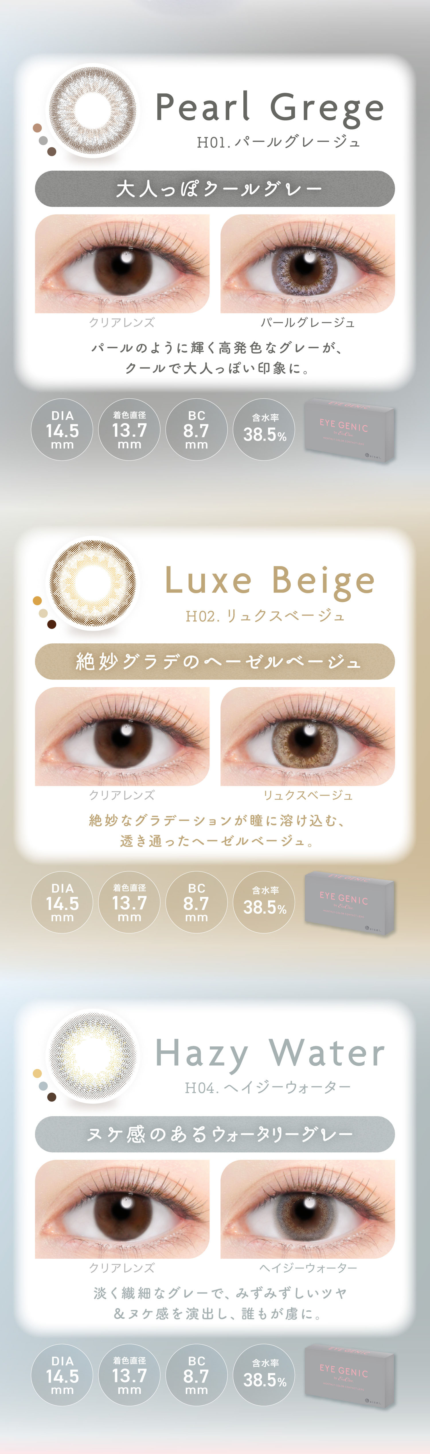 【商品スペック】DIA 14.5mm/BC 8.7mm/含水率 38.5%/着色直径 13.7mm